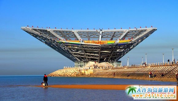 “渤海明珠觀景臺”位于山海廣場潛堤西端,觀景臺總體造型如貝殼狀。由于觀景臺的造型特殊,懸挑之大、荷載之大均為國內少見,其施工難度不亞于“鳥巢”。
