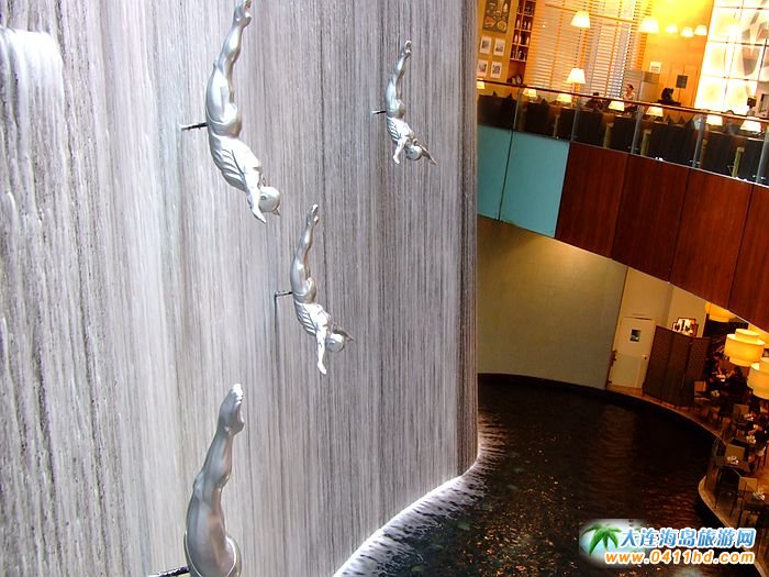 迪拜購物中心中的人工瀑布景觀,構(gòu)成了現(xiàn)代商業(yè)空間的新構(gòu)思、新發(fā)展,購物中心的中庭空間歷來是設(shè)計師精心設(shè)計的地方,中庭空間中設(shè)置瀑布景觀將中庭設(shè)計帶來了新的思路。每一件雕塑作品都是一個高臺跳水的動作,并且動作相同,整齊劃一,吸引了不少游客駐足拍照。