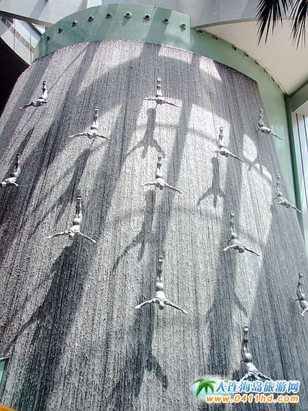 迪拜購物中心中的人工瀑布景觀,構(gòu)成了現(xiàn)代商業(yè)空間的新構(gòu)思、新發(fā)展,購物中心的中庭空間歷來是設(shè)計(jì)師精心設(shè)計(jì)的地方,中庭空間中設(shè)置瀑布景觀將中庭設(shè)計(jì)帶來了新的思路。每一件雕塑作品都是一個(gè)高臺(tái)跳水的動(dòng)作,并且動(dòng)作相同,整齊劃一,吸引了不少游客駐足拍照。