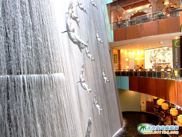 迪拜購(gòu)物中心中的人工瀑布景觀,構(gòu)成了現(xiàn)代商業(yè)空間的新構(gòu)思、新發(fā)展,購(gòu)物中心的中庭空間歷來(lái)是設(shè)計(jì)師精心設(shè)計(jì)的地方,中庭空間中設(shè)置瀑布景觀將中庭設(shè)計(jì)帶來(lái)了新的思路。每一件雕塑作品都是一個(gè)高臺(tái)跳水的動(dòng)作,并且動(dòng)作相同,整齊劃一,吸引了不少游客駐足拍照。