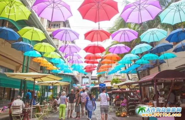蔻丹廣場有一條“網(wǎng)紅”街,街道上空掛滿五顏六色的雨傘,成為路易港一道最靚麗的風(fēng)景。這里也是一個大型購物中心,集中了各式各樣的商鋪,在這可以買到服飾、護(hù)膚品以及當(dāng)?shù)靥厣募o(jì)念品。
