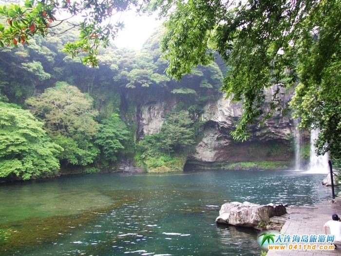 沿著天地淵溫帶樹林徒步行走1公里左右,就會聽到驚天動地的瀑流聲,白色的瀑布仿佛銀河落九天,非常壯觀。瀑布寬12米,高22米。瀑布下的潭水深20米,潭水清澈無比,這就是聞名遐邇的韓國濟州島天地淵。