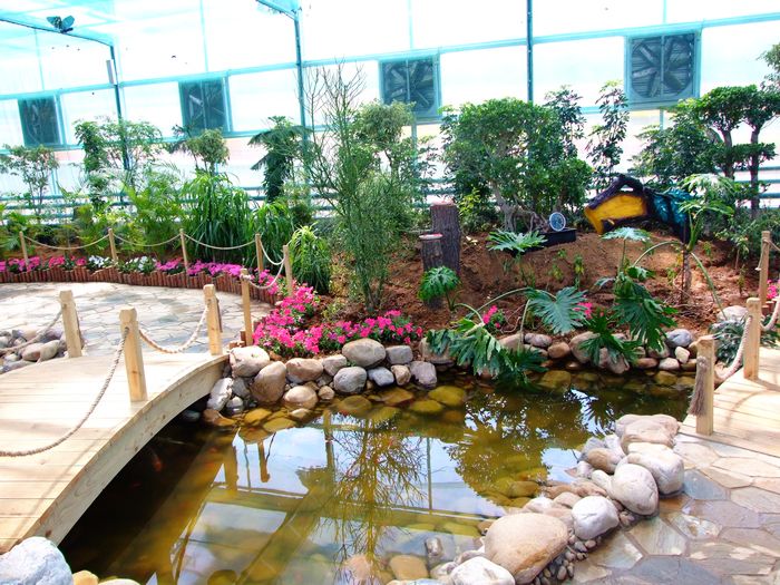 走進(jìn)旅順蝴蝶園中的蝶戀花區(qū),盡管是在室內(nèi),但宛若走進(jìn)了一處南國風(fēng)情的鄉(xiāng)間小隅,潺潺的流水,彎彎的小橋,石頭鋪就的小路,還有翠綠的葉,嬌艷的花,舞動的蝶,更有在水中游動的紅鯉,這就是大師筆下的一副彩色山水圖。