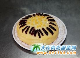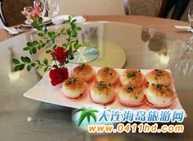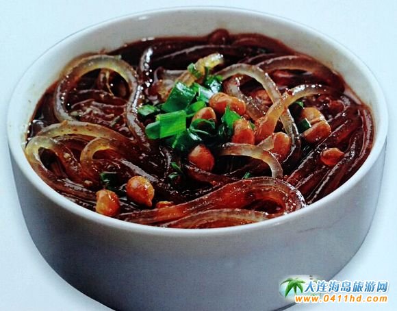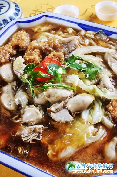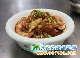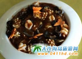 三鮮燜子 燜子是大連的特色小食,是用地瓜淀粉熬制出來的,結(jié)成塊后,掰成小塊,然后用油煎成兩面成硬皮。后來有廚師根據(jù)大連人愛吃海鮮的特點(diǎn)研發(fā)了“三鮮燜子”,由于口味頗受歡迎,慢慢演變?yōu)榻鹬堇喜颂厣,其口味咸鮮、香嫩適口。