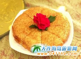 黃金大餅是每桌客人必點(diǎn)的主食,此餅外酥里嫩,配上芝麻和咸蛋黃,非常美味。具體作法是將普通面粉、牛奶、酵母、白芝麻等所有原料混合揉勻發(fā)酵到兩倍大,發(fā)酵好的面團(tuán)排氣在揉成一個(gè)圓形按扁,表面刷點(diǎn)水均勻的裹上白芝麻進(jìn)行二次發(fā)酵,將再次發(fā)酵好的面團(tuán)放在蒸鍋里蒸15分鐘,放涼炸至金黃即可。