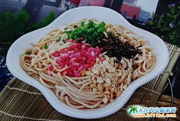肉絲炸炒面也是金州老菜,也叫大炒面,工序比較繁雜。切面煮至八成熟,下油鍋炸至金黃色。再用沸水煮至回軟,加肉絲圓蔥調(diào)味料下勺煸炒而成。此菜的特點(diǎn)是軟硬適度,香氣撲鼻色澤金黃。