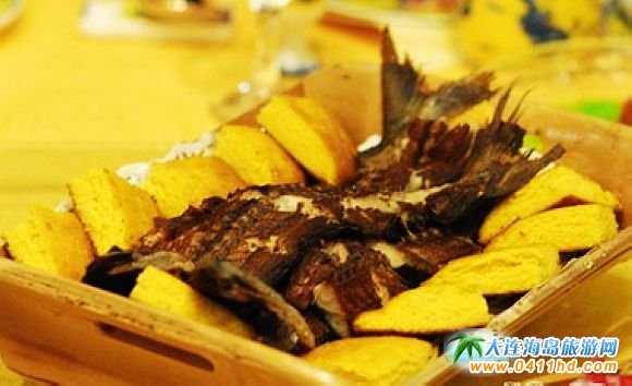 咸魚餅子 勇杰大餅子咸魚店的咸魚餅子非常有名,其咸魚的制作方法為:選個(gè)大的魚,殺后,洗凈。剁下魚頭,將魚身用腌制鹽涂滿,放入盆中。放陰涼處,約一個(gè)星期,每天將魚翻個(gè)身。取出,用繩穿上,涼在陰涼處,風(fēng)干即可。放在鐵鍋里,擱少許油,烤得外焦里嫩,和餅子一起吃味道獨(dú)特。
