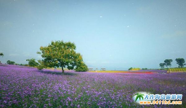 站在大連金石灘心悅島文化休閑公園觀景臺上瞭望,紫色花海盡頭就是藍色的大海,金黃色的沙灘更是與周邊綠色的草坪、森林相得益彰。