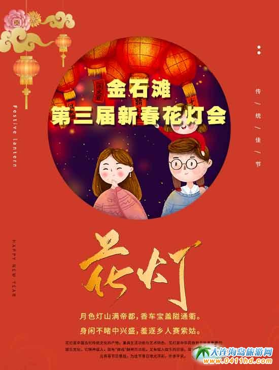 1月17日(臘月二十三,星期五)至2月23日(二月初一,星期日),每日17:00至21:30亮燈;魰攸c位于金石灘國家旅游度假區(qū)文化博覽廣場(金石灘輕軌站北側東行100米即達)。花燈會活動特邀連續(xù)八屆參加央視中秋晚會設計團隊和“非遺”四川自貢彩燈專業(yè)公司設計制作。設置“盛世中國年”“夢幻童真樂”“光影探秘秀”“華夏傳承光”“燈之經典作”5大主題展區(qū)、80余組大型燈組,成為大連歷史上展示規(guī)模最大、數量最多的花燈會。花燈會現場提供餐飲、購物、互動娛樂、民俗展演、現場演繹等配套服務項目。