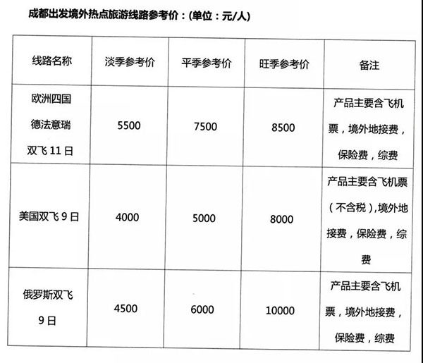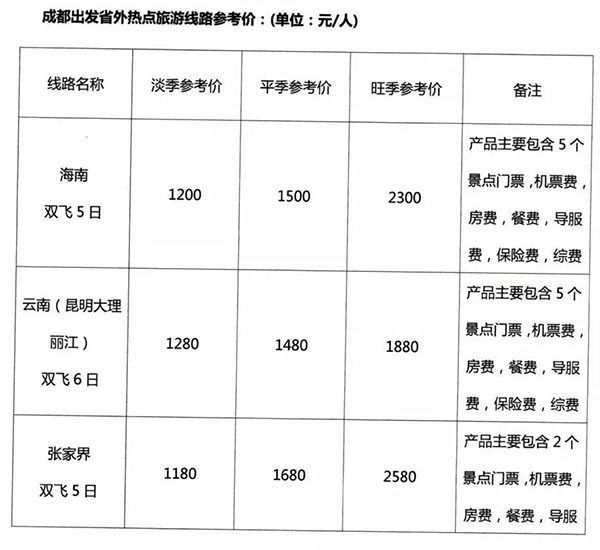 近日,四川省旅行社協(xié)會、成都市旅行社協(xié)會公布了2019年四川旅游線路參考價。共有從成都出發(fā)的42條旅游線路,分省內(nèi)、國內(nèi)和境外游三類,指導(dǎo)價分為淡季、旺季、平季三種(一般旅游淡季為11月16日~3月31日,平季為4月1日~7月31日,旺季為8月1日~11月15日)。