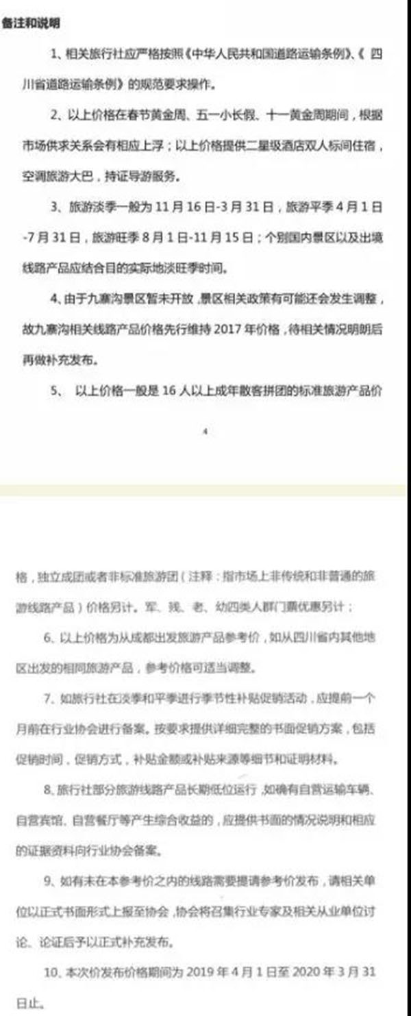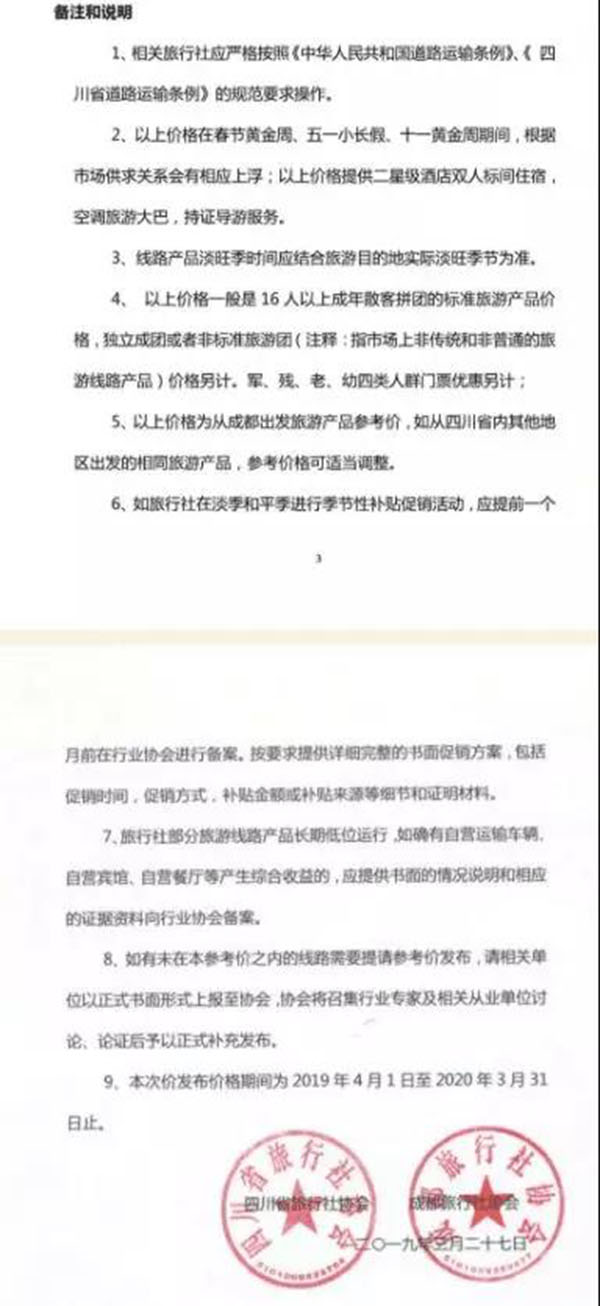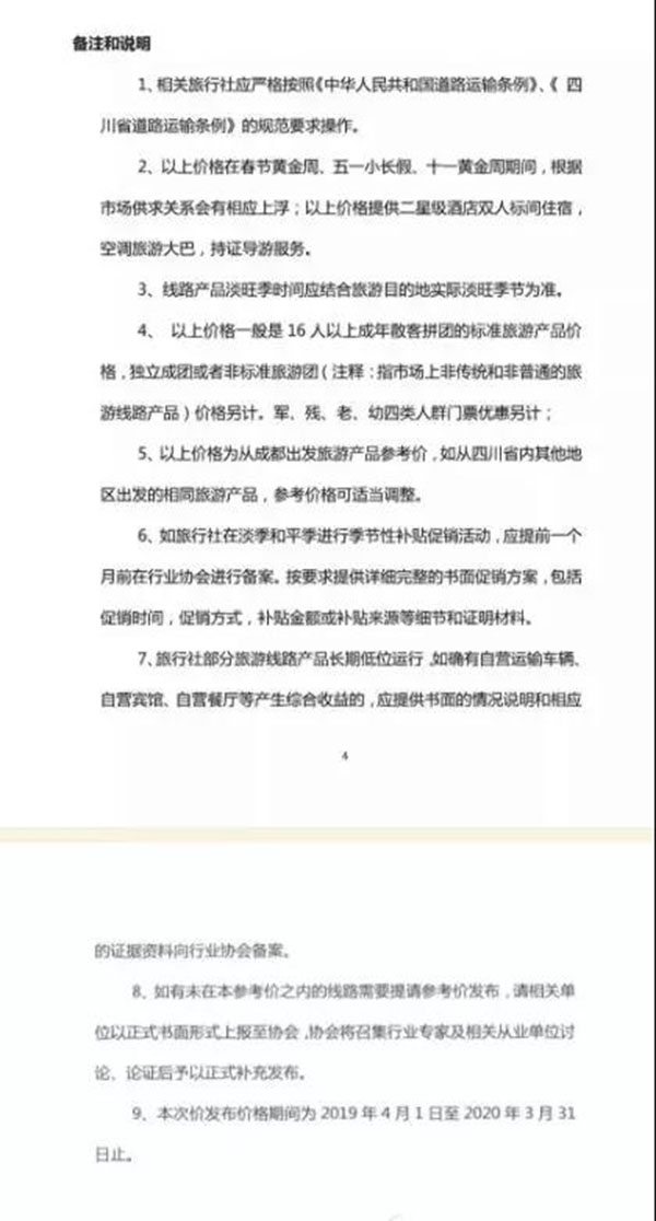 值得注意的是,此次公布的2019年旅游線路參考價一般是16人以上成年散客拼團的標準旅游產(chǎn)品價格,獨立成團或者非標準旅游團(指市場上非傳統(tǒng)和非普通的旅游線路產(chǎn)品)價格另計,其出發(fā)地均為成都,如從四川省內(nèi)其他地區(qū)出發(fā)的相同旅游產(chǎn)品,參考價格可適當(dāng)調(diào)整。在2019年4月1日至2020年3月31日期間,均將執(zhí)行該價格區(qū)間。