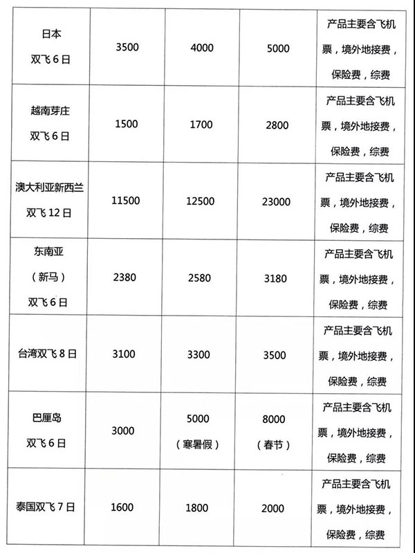 在出境游方面,澳大利亞、新西蘭雙飛12日的價格仍處高位,淡平旺三季均破萬元,分別是11500元、12500元和23000元。泰國常年高居川人出境游排行榜第一位,今年泰國的跟團價格究如何呢?以泰國雙飛7日游為例,今年淡季、平季和旺季的價格分別為1600元、1800元和2000元,與去年持平,產(chǎn)品主要含飛機票、境外地接費、保險費、綜費。在