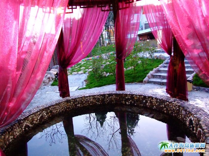 旅順香格里湯泉宮室外溫泉景觀山石和紅綠相間的樹木,人工雕琢與自然風物渾然一體,山澗溪水與溫泉泡池錯落有序;異形室外浴,木質(zhì)茶樓與溫泉會館,水療中心交相輝映。