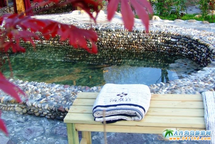 旅順香格里湯泉宮室外溫泉景觀山石和紅綠相間的樹木,人工雕琢與自然風物渾然一體,山澗溪水與溫泉泡池錯落有序;異形室外浴,木質茶樓與溫泉會館,水療中心交相輝映。