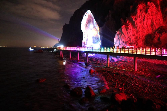 《一崖》——九丈崖山崖險(xiǎn)峻,水深流急,巖礁棋布,自然景觀獨(dú)樹一幟。崖壁綿延400余米,景區(qū)集山、海、礁、崖、洞及古跡于一體,融奇、雄、秀、美、險(xiǎn)、神于一身,是長島最值得游玩的景區(qū)之一。