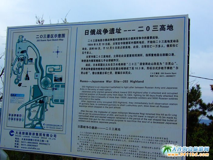 二○三景區(qū)位于旅順國家級森林公園之中,距旅順市區(qū)3公里,占地近50萬平方米。景區(qū)內(nèi)保存有大面積四季常青的黑松林和3.3萬平方米的櫻花園,是國家森林公園、省級文物保護單位。 203高地是日俄戰(zhàn)爭期間旅順陸戰(zhàn)中西部戰(zhàn)線最激烈的主戰(zhàn)場,因海拔高度203米,故稱之為“203高地”。1904年9月9日始,日軍出動兵力6.4萬人,由第三軍司令乃木希典親自督戰(zhàn),先后向203高地發(fā)動了70余次沖鋒,最終以1.7萬人的傷亡代價,于當(dāng)年12月5日攻占該高地。
