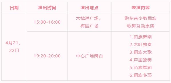 4月21、22日 15:00-16:00 木棧道廣場、梅園廣場 黔東南少數(shù)民族歌舞互動表演,19:20-20:00 中心廣場舞臺