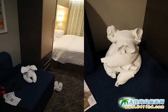 量子號(hào)游輪上的客房基本分為內(nèi)艙房、海景房、陽(yáng)臺(tái)房和套房。內(nèi)艙房位于船身內(nèi)部,房間沒(méi)有窗戶,但墻壁上安裝了電子顯示屏,實(shí)時(shí)播放著室外的海景,使人視覺(jué)上感到如窗戶一樣。陽(yáng)臺(tái)房是以4星級(jí)酒店的要求為標(biāo)準(zhǔn),里面各種設(shè)施一應(yīng)俱全,服務(wù)生一天兩次打掃衛(wèi)生,驚喜的是會(huì)在房間里看見(jiàn)用毛巾做出的栩栩如生的動(dòng)物造型。
