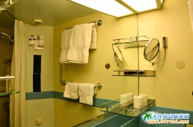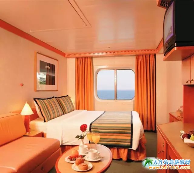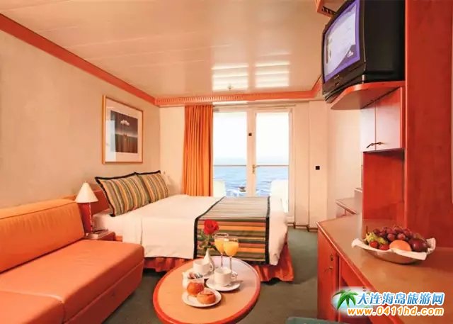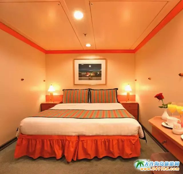 接著隆重登場的就是郵輪的客房了?头糠譃樘追俊⒑>胺、陽臺海景房和內(nèi)艙房。部分房間配備1-2張伸拉式折疊床,獨立衛(wèi)生間,電視、冰箱、電話等一應(yīng)俱全。