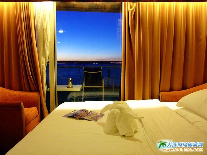 海洋神話號郵輪豪華套房面積約44㎡,配備有可以并和成雙人床的兩只單人床,并且配有可展開作為床鋪的長條沙發(fā),最多可容納3人(或2大人2兒童)入住,海景套房最大亮點是房間的位置以及露天觀景陽臺,位置都在郵輪的第八層,在船尾的位置,不同于普通房間在船艙的兩側,因此觀景角度視覺非常突出。房間內配有私人浴室,冰箱,化妝臺,電吹風,電視機,電話,110V-220V的電源,保險柜,躺在床上,既可以透過落地玻璃窗觀賞到外面的海景。