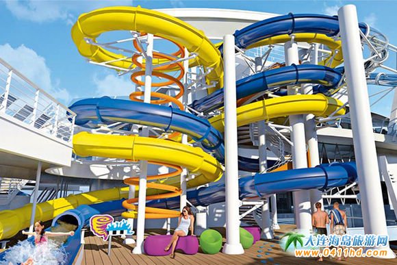 “海洋和諧號”最值得一提的是名為“終極深淵”的10層滑道,這是全球最大的船上滑梯。該紫色滑梯從郵輪的尾端清晰可見。愛好冒險的游客可以沿著超過30米長的蛇形滑道,以每小時14公里的速度滑下;械倪^程中,四周還會有聲光效果烘托氣氛,使得滑梯更具吸引力。