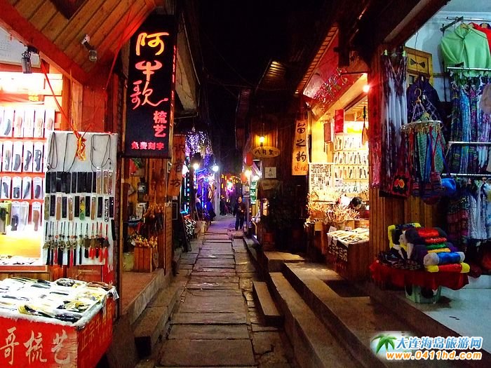 這里既有繼承百年的老字號(hào),也有招牌雷人的現(xiàn)代商號(hào),總之,在鳳凰古城狹小的街道兩側(cè),各種商鋪展示著這里的繁榮,斑駁的磚墻燙金的大字散發(fā)著沉香,新穎的裝飾潮流的商品流淌著時(shí)尚,徜徉于人群,一不小心就穿越在古今之中。  大連到張家界旅游小記!以上鳳凰古城圖片拍攝于2011年11月20日(大連海島旅游網(wǎng)原創(chuàng))